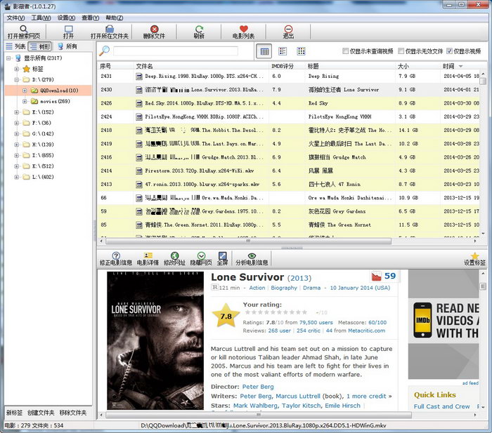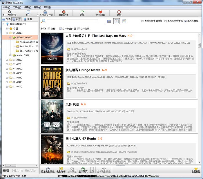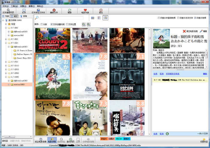 影藏者可以自动搜索出整个电脑的所有电影、连续剧,包括视频文件、种子文件(torrent ),并能自动归类(加上标签,例如动作片等),自动识别出IMDB评分分数、导演等信息,同时配合文件夹分组整理,让你对自己所有的电影一目了然。甚至可以进一步通过网络自动搜索出电影的海报,内容简介等更详细的信息。电影以评分,或者以时间排列、大小排列等等,你可以按分数顺序进行观看或者删除。你可以手工设置电影的标签,还可以手手工把一堆连续剧视频文件合并在一起当作一个合集。某天,如果你要下载某部电影,却又不确定是否已经下载过,则可以通过影藏者快速搜索立即可以知道电脑中是否已经存在同样的电影。 截图参考: 表格视图: